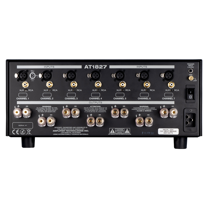 Beginning with the the two-channel AT1822 to the seven-channel AT1827, all AT1820 Series amplifiers feature ATI’s Soft Turn-on protection. The Soft Turn-on circuit gradually powers up the amp to avoid tripping the circuit breaker or dimming the lights. At the back of the amplifier, an RCA unbalanced input, an XLR Balanced input, input selection switch and a pair of gold-plated, 5-way binding post outputs support each channel. There is also a 1/8” mono mini jack for +12V trigger, a gold-plated chassis ground lug, a fuse holder and an IEC 20 Amp inlet for the provided detachable power cord. The supplied power cord will have either: a NEMA 5-15 plug (Type B) for use in the USA, a BS 1363 (Type G) plug for use in the UK, or a Schuko (Type F) plug for use in the EU and the rest of the world.