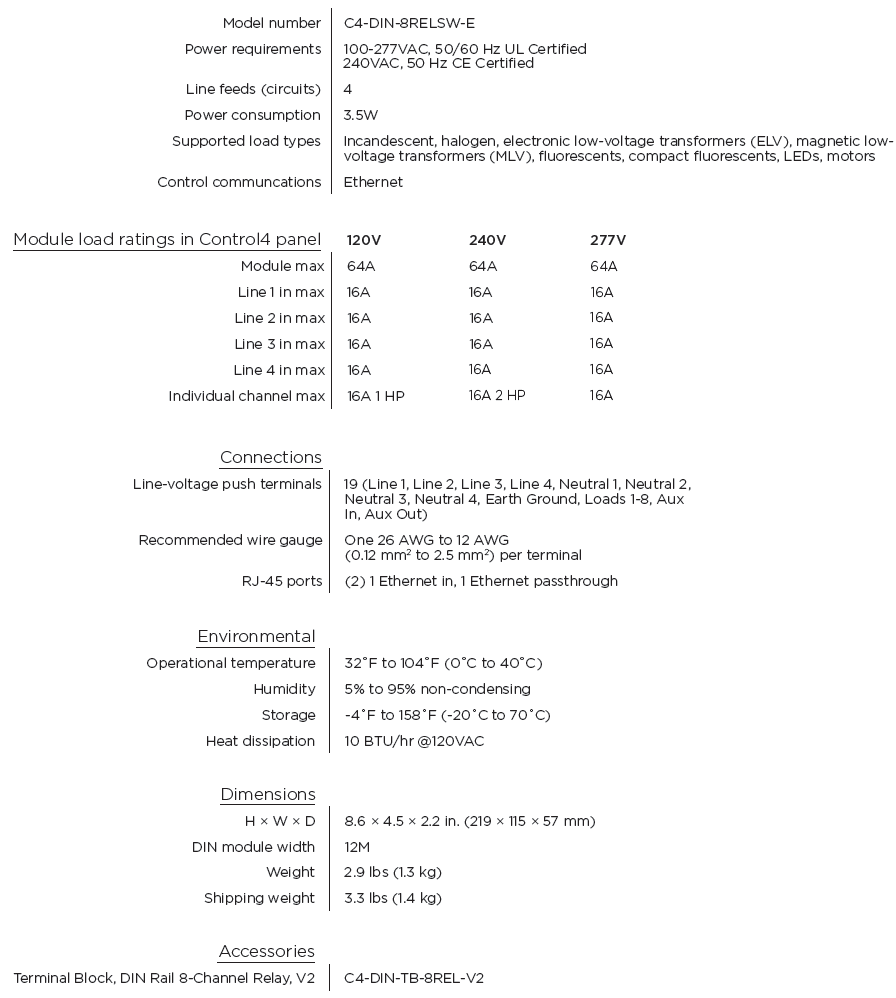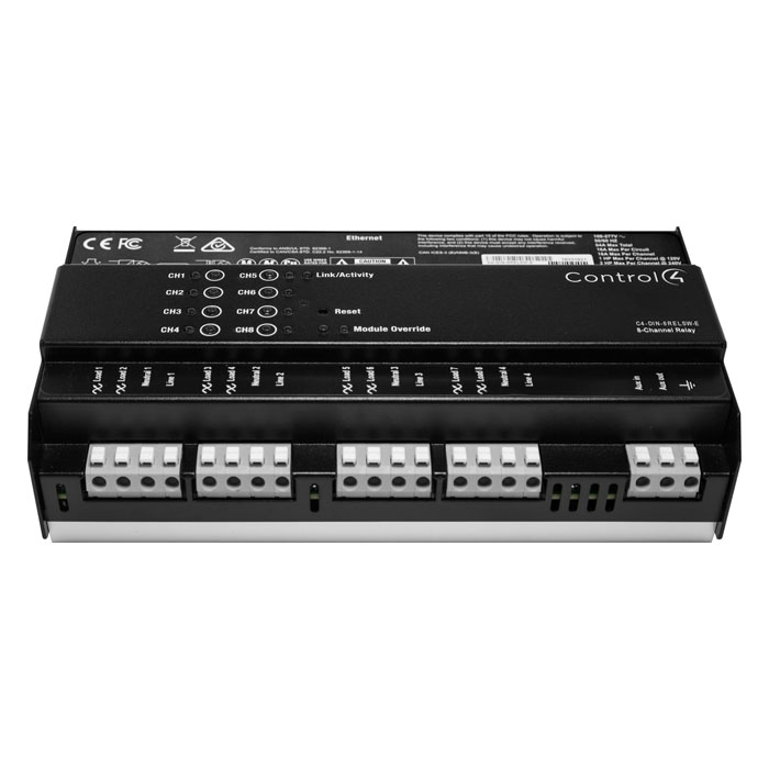 The Control4® DIN-Rail 8-Channel Relay V2 Switch controls up to eight high in-rush loads from one module in the Control4 system. Each channel supports a variety of load types, including incandescent, halogen, electronic low-voltage transformers, magnetic low-voltage transformers, fluorescents, compact fluorescents, LEDs, and motors.