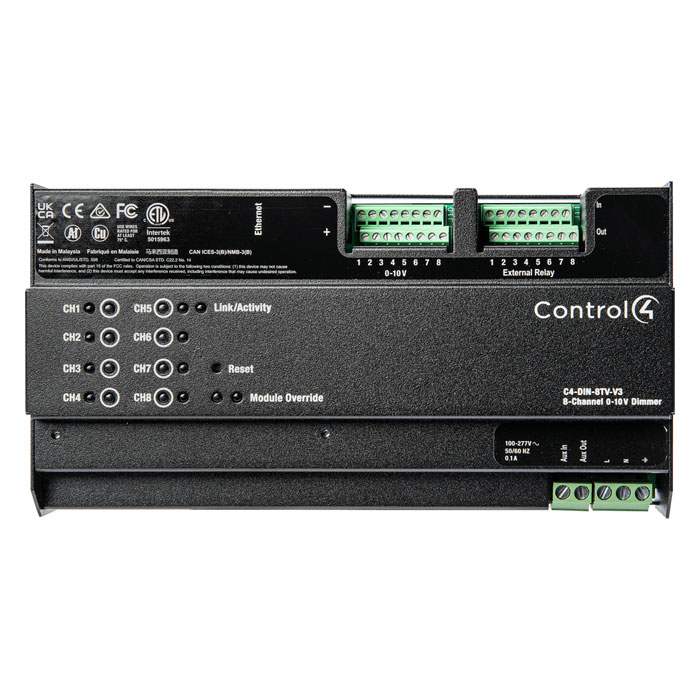 The Control4® 8-Channel 0-10V Dimmer controls up to eight (8) 0-10V dimmable fluorescent ballasts or LEDs. Each channel can control up to 50 ballasts. Individual 0-10V lights can be programmatically tied to a corresponding channel on a Control4® 8-Channel Relay module for on/off control of the ballast or LED when needed. Alternatively, the Control4 8-Channel 0-10V Dimmer module also has eight (8) low-voltage outputs for triggering external power relays.
