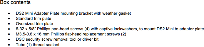 The Control4 DSC to DS2 Mini Adapter Kit is designed to enable upgrading a first-generation Door Station (C4-DSC-EN-xx) to the new DS2 Mini (C4-DS2MINI-xx) while using the old door station’s wall box. The kit provides the adapter plate that connects to the first-generation door station metal back box, a standard trim plate that fits the exact profile of the first-generation Door Station, an oversized trim plate with a uniform border and all required screws, weather gasket and security screw tool required for installation.