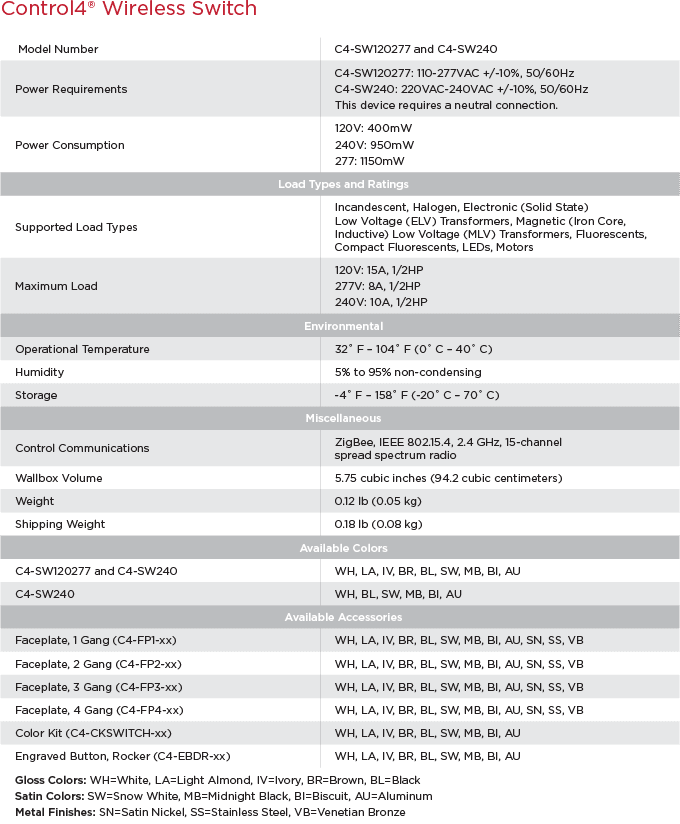 Get on/off control for virtually every type of load, including LED lights, incandescents, halogens, electronic low voltage (solid-state) transformers, magnetic (iron core) low voltage transformers, fluorescents, compact fluorescents, and motors, including ceiling fans and bathroom ventilation fans. The Wireless Switch also handles high in-rush loads such as fountain pumps or large banks of fluorescent lights and can be used to switch wall outlets. Available in 6 stylish colors and finishes. 120V/277V or 240V.