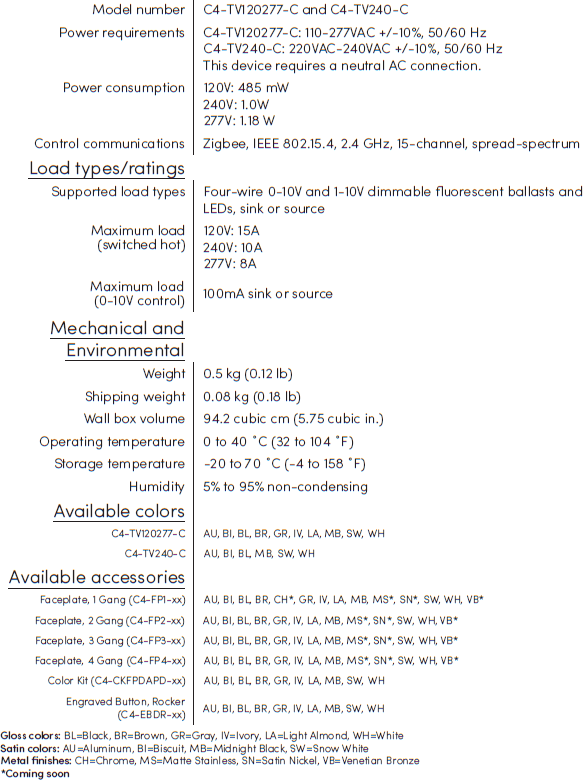 Experience elegant, in-wall control of the increasingly popular 4-wire 0-10V dimmable fluorescent ballasts and LED lights. Available in 10 stylish colors and finishes to complement any décor. 120V/277V or 240V.