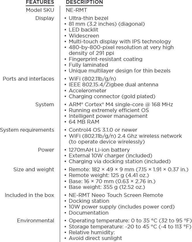 The Neeo Remote for Control4 puts the power of Control4 Smart Home OS 3 in the palm of your hand. Engineered by our team of Swiss designers, the remote’s machined aluminum chassis and intuitive interface are expertly crafted to bring a highly refined experience to your media room. The Neeo Remote controls television, movies, music, lights, thermostats, and virtually anything else in a Control4 Smart Home. Its 81 mm (3.2-inch), high-resolution touchscreen and software-driven graphical interface reduce the number of buttons and make personalized features of Smart Home OS 3—like favorites—available now from a handheld remote. It includes physical buttons for the essentials, so it’s easy to mute the movie or adjust the volume without looking down. The Neeo Remote is more than a television remote—it is a smart home interaction device that is always available and easy for anyone to use.